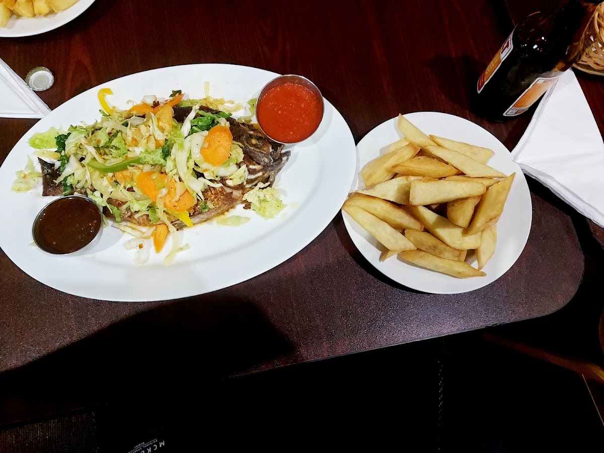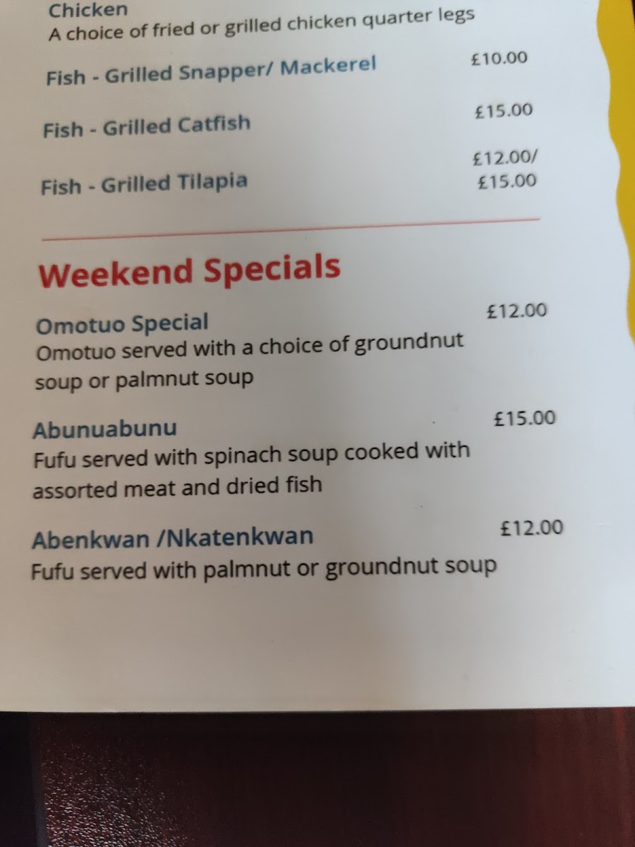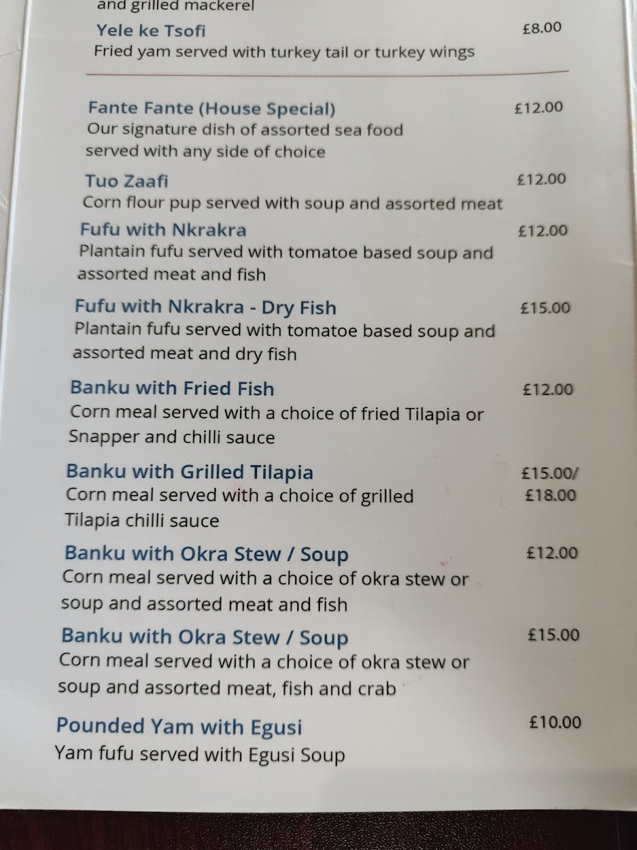 If you're seeking something a bit different, the Waakye with Beef Stew is a must-try. This dish features black-eyed beans cooked to perfection alongside tender beef stew, creating a hearty meal that’s as comforting as it is flavorful—again, offered at a reasonable price of £14.00. For seafood lovers, the Grilled Tilapia comes highly recommended. Grilled to your liking and served with your choice of sides for £15.00, this dish is a fresh and delightful experience that celebrates the flavors of the ocean.